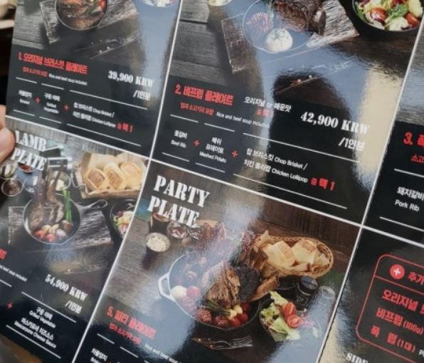 오리지널 브리스킷은 39,900원, 비프립 플레이트 42,900원, 파티 플레이트(4인) 164,900원입니다. 그 외에도 추가 고기가 가능하고 사이드로 찹 브리스킷, 매쉬포테이토, 치킨 롤리팝, 구운 옥수수, 구운 야채, 비프볼 등이 준비되어 있습니다.