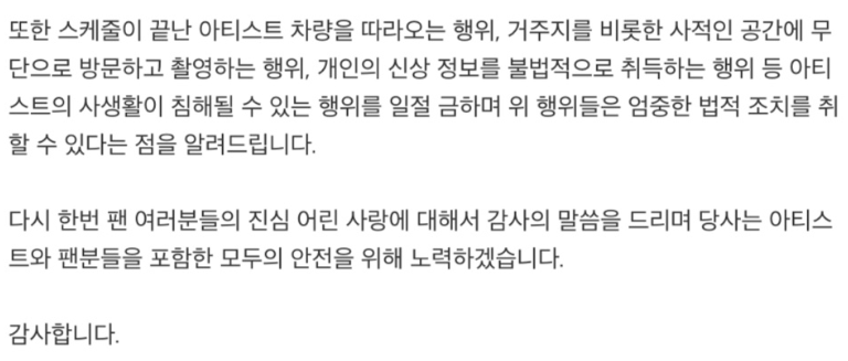 또한 스케줄이 끝난 아티스트 차량을 따라오는 행위, 거주지를 비롯한 사적인 공간에 무단으로 방문하고 촬영하는 행위, 개인의 신상 정보를 불법적으로 취득하는 행위 등 아티스트의 사생활이 침해될 수 있는 행위를 일절 금하며 위 행위들은 엄중한 법적 조치를 취할 수 있다는 점을 알려드립니다.