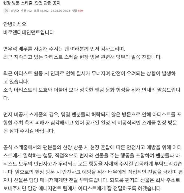 변우석 사생팬 관련 소속사 공지 전문